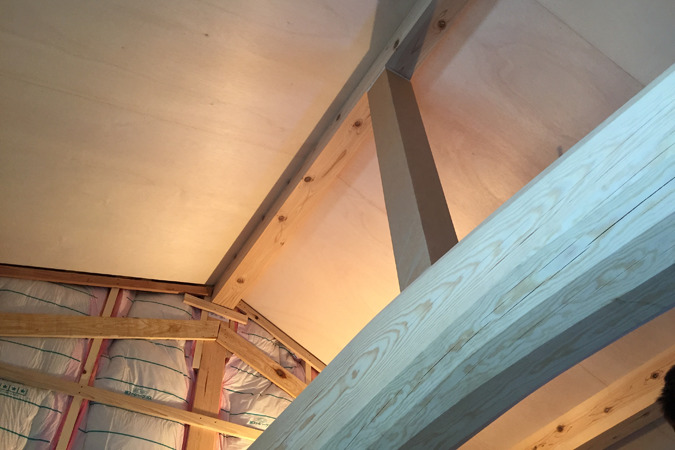 東区の小さな家 / 合板張り 設計事務所の日々2017.04.04東区の家は屋根勾配にそった天井をつくり、小屋組みの棟木、母屋、小屋梁、小屋束という構造部材を現しでみせるデザインです。天井には、仕上げになるラワン合板を張り始めました。ビニルクロスとは表情が異なり、木造らしい雰囲気が望めます。