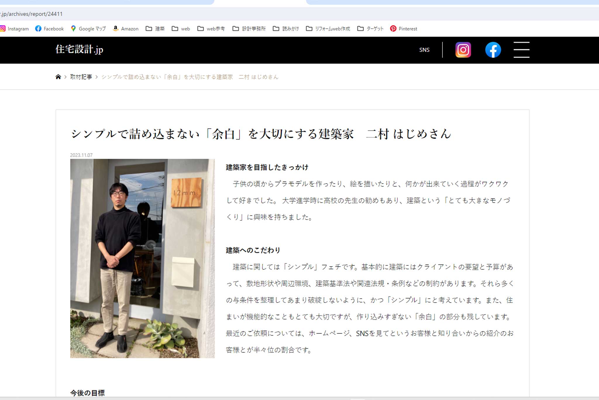 お知らせ/住宅設計.jp お知らせ2024.01.12去年の年末に取材して頂いた内容を、住宅設計.jpに掲載していただきました。お時間のある時にご高覧くださいませ。https://xn--pqqp11avm0bhea.jp/archives/report/24411